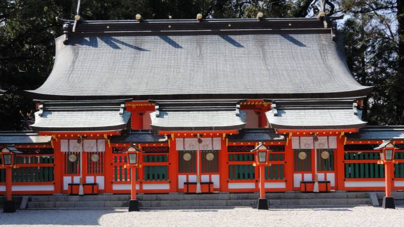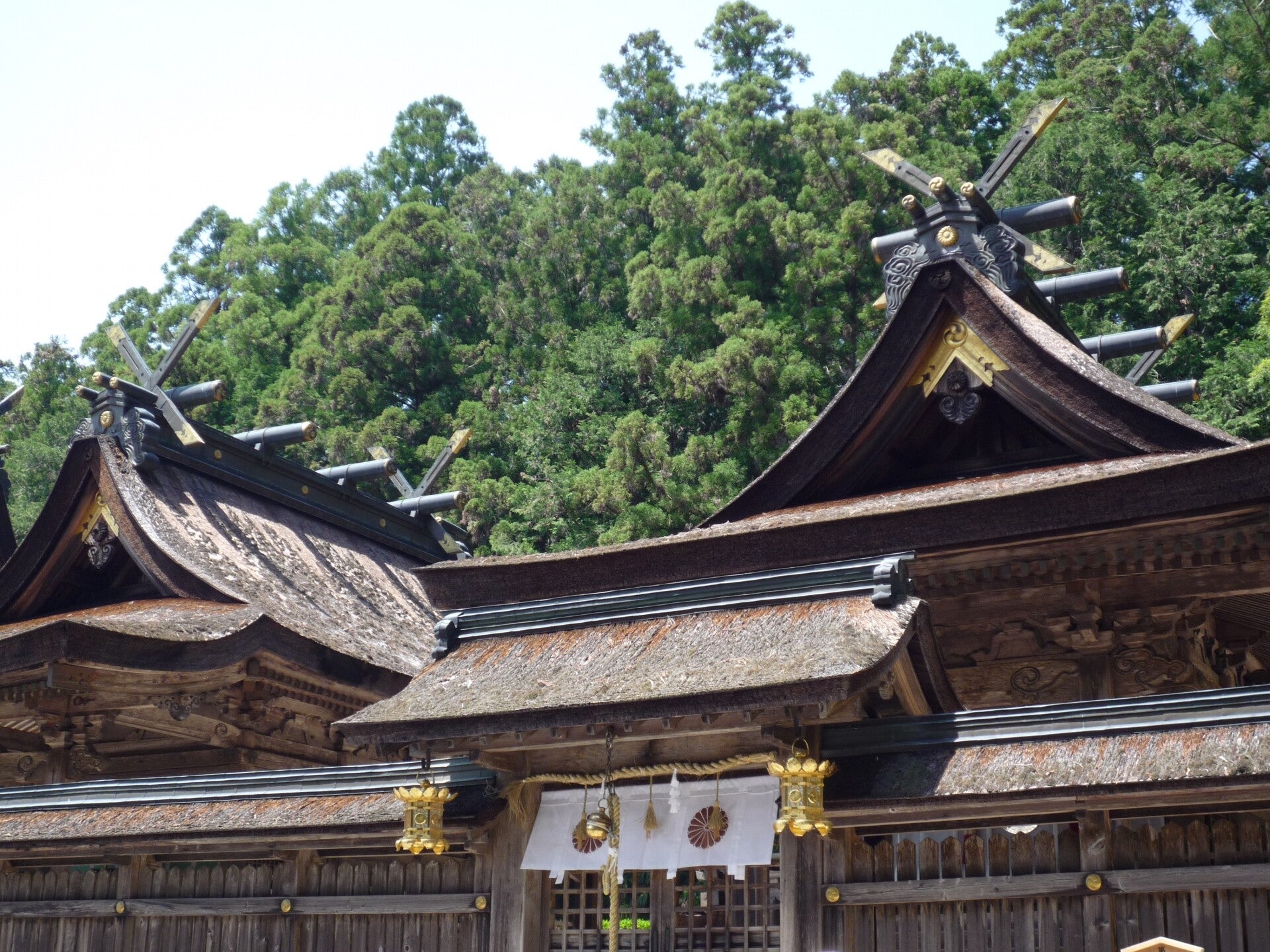 Originariamente situato nella piana fluviale di Oyunohara, il santuario fu ricostruito nella posizione attuale dopo una grande alluvione nel XIX secolo. La vasta area originaria è oggi segnata dal maestoso torii di Oyunohara, il più grande del Giappone, che indica simbolicamente l’ingresso nello spazio sacro.